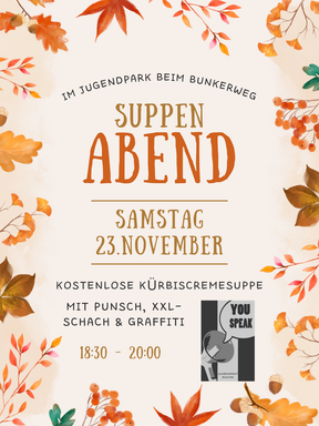 Auch dieses Jahr veranstalteten wir wieder einen Suppenabend im Jugendpark. Diesmal hatten Besucher ausserdem die Möglichkeit, mit Spraydosen ein Graffiti an unsere Künstlerwand zu sprayen oder eine Runde XXL-Schach zu spielen. Die Kürbiscremesuppe, gekocht von Ex-Jugendratspräsident Amadeo Noser, schmeckte allen hervorragend und machte diesen kalten Novemberabend etwas angenehmer. Im Verlaufe des Abends kamen ca. 30 Gäste in den Jugendpark und genossen den Abend. Bilder des Events findest du hier.